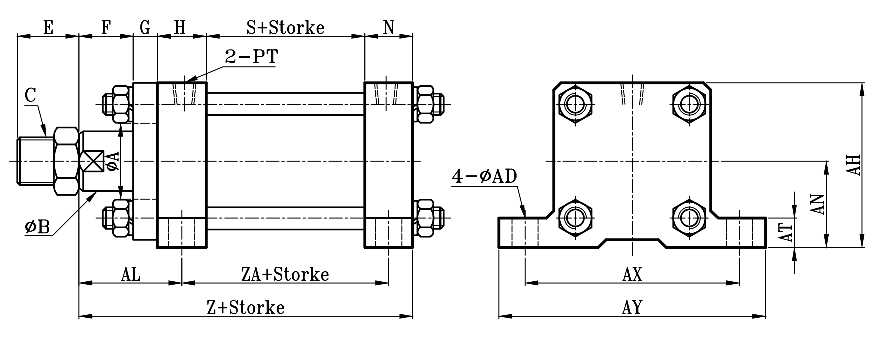 | 缸徑 BORE | ΦA(chǔ) | ΦB | C | E | F | G | H | N | PT | S | AL | ZA | ZAD | Z | ΦA(chǔ)D | AT | AH | AN | AX | AY |