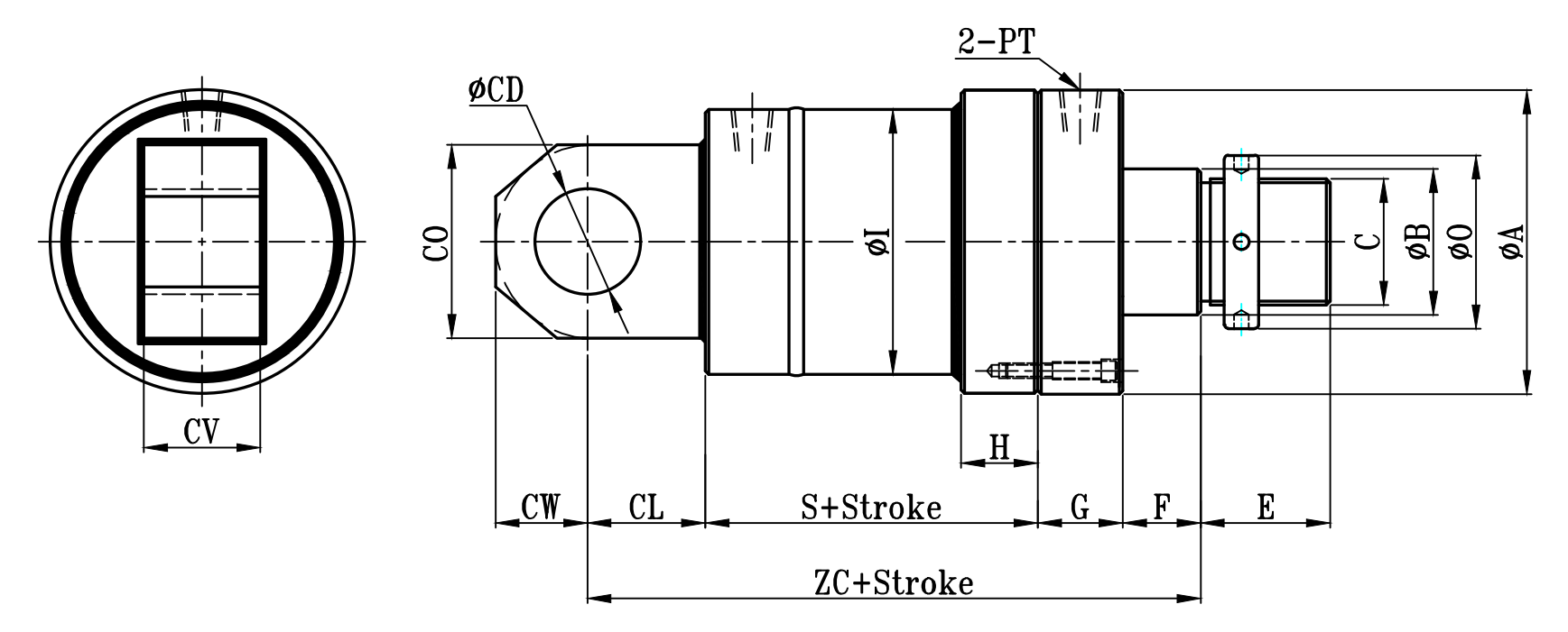 | 缸徑 BORE | ΦA | ΦB | C | H | ΦI | Φ0 | E | F | G | G1 | S | S1 | ZC | ZC1 | ΦCD | CV | CW | CL | CO | PT |