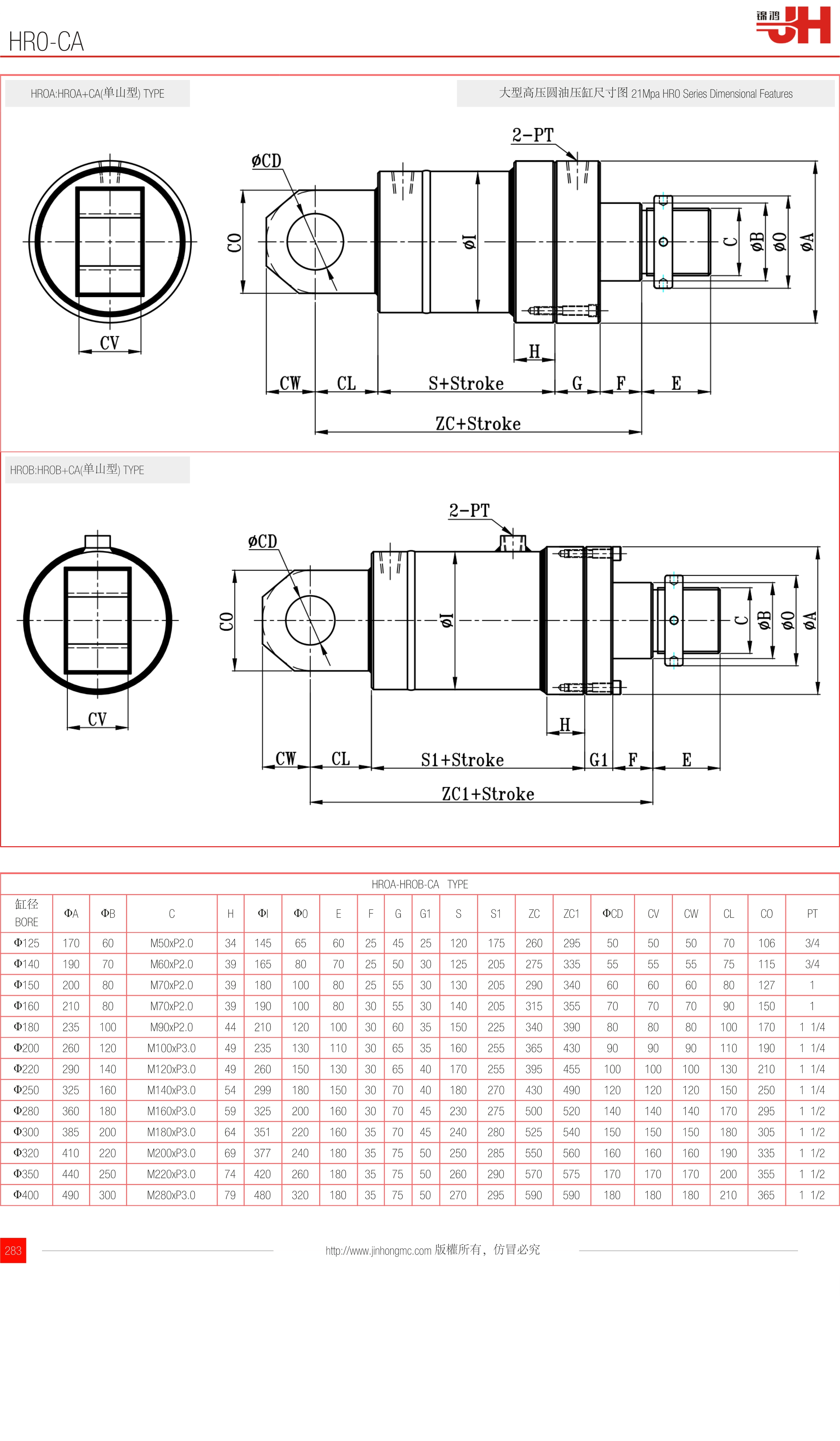 HROA:HROA+CA(單山型) TYPE | 大型高壓圓油壓缸尺寸圖 21Mpa HR0 Series Dimensional Features |