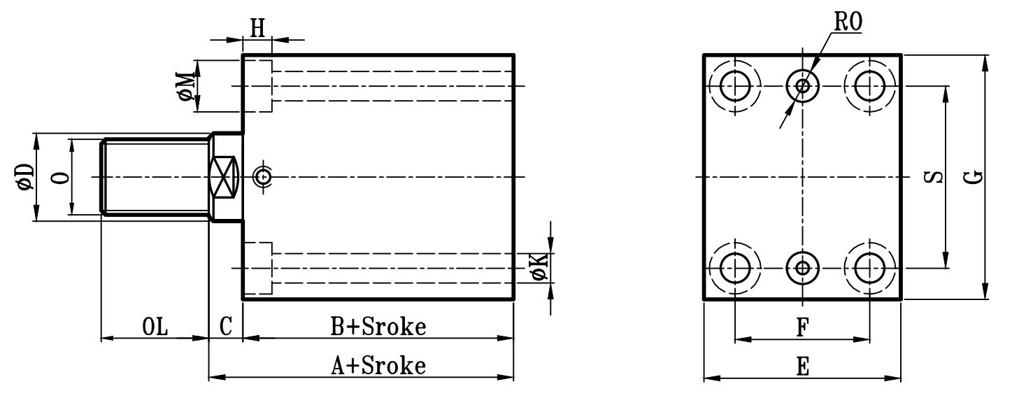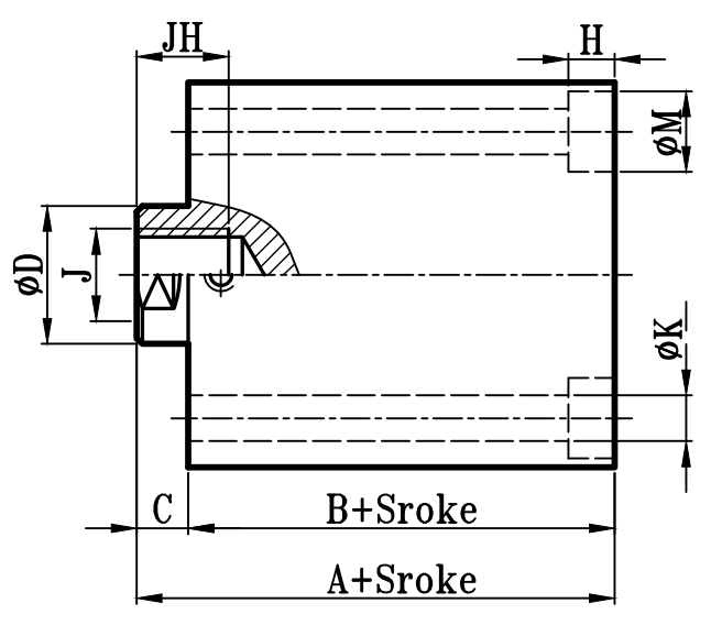 | 缸徑 BORE | A | B | C | ΦD | E | F | S | G | ΦK | ΦM | H | RO | J | JH | O | OL | W | ΦV |