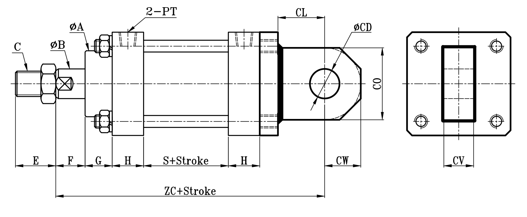 | 缸徑 BORE | ΦA | ΦB | C | E | F | G | H | PT | S | ZC | ΦCD | CL | CV | CW | CO | CX |