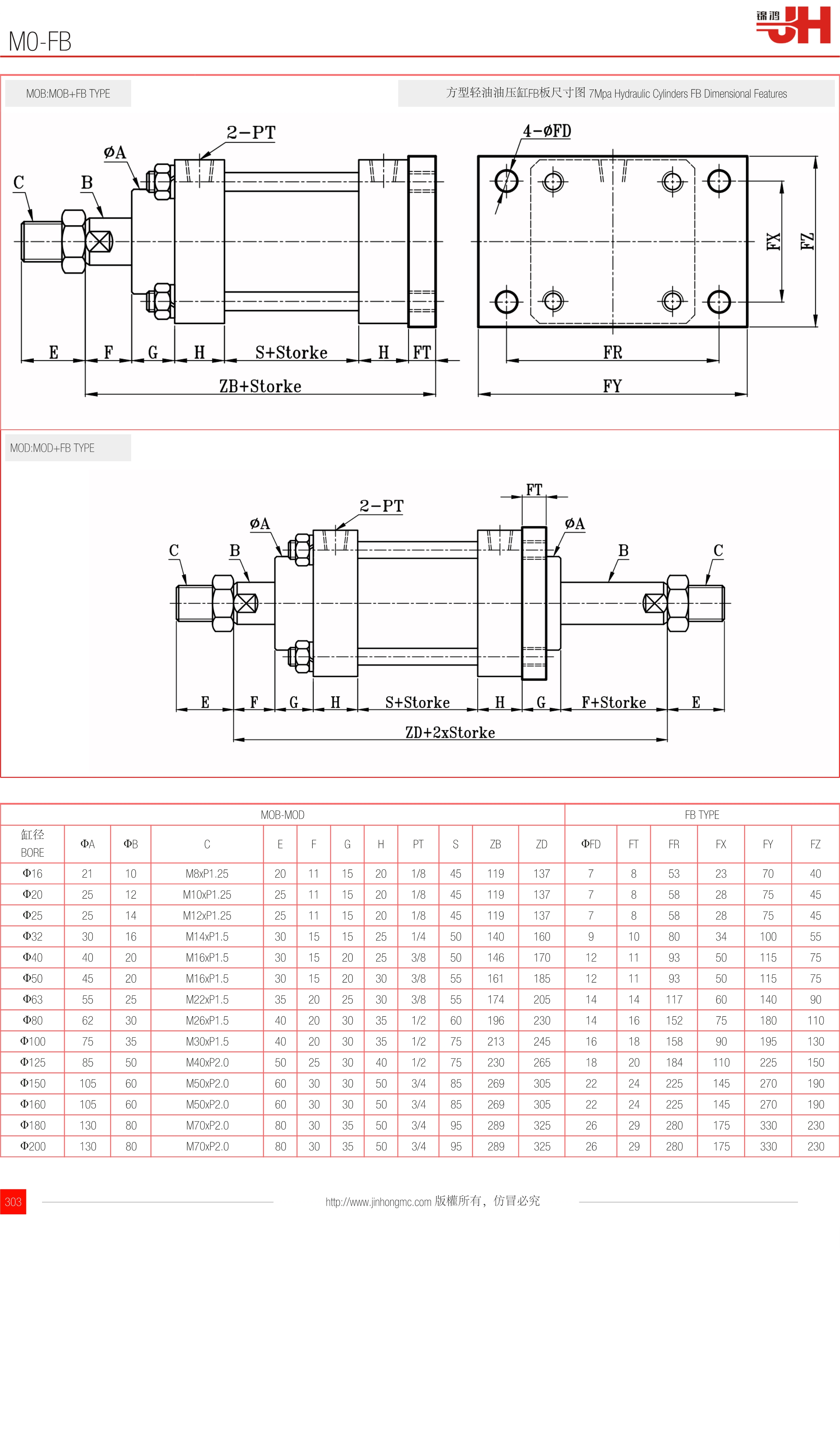 MOB:MOB+FB TYPE | 方型輕油油壓缸FB板尺寸圖 7Mpa Hydraulic Cylinders FB Dimensional Features |
