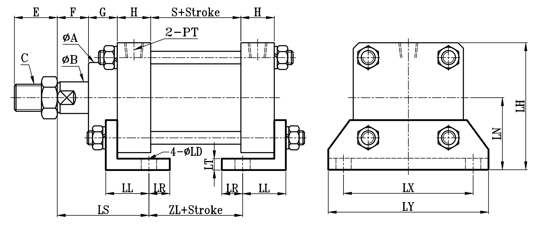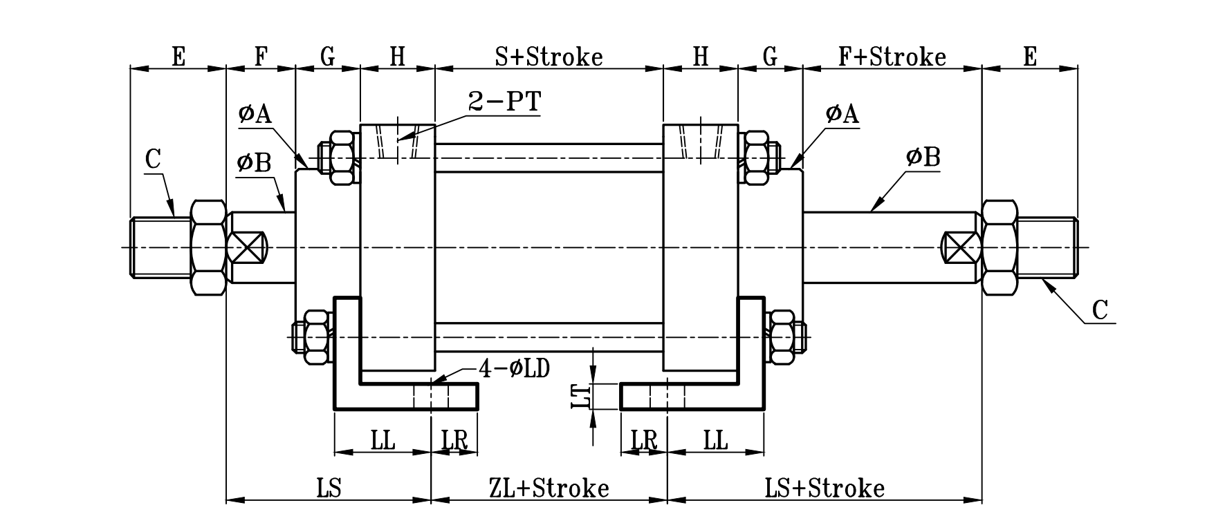 | 缸徑 BORE | ΦA | ΦB | C | E | F | G | H | PT | S | LS | ZL | ΦLD | LH | LN | LL | LR | LT | LX | LY |