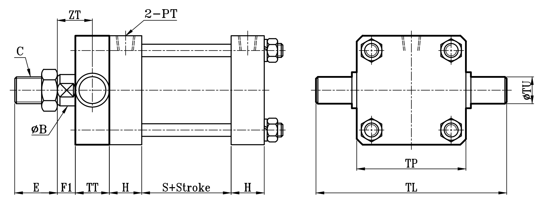 | 缸徑 BORE | ΦA | ΦB | C | E | F | F1 | G | H | PT | S | ZT | ZD | TL | TP | TT | ΦTU |