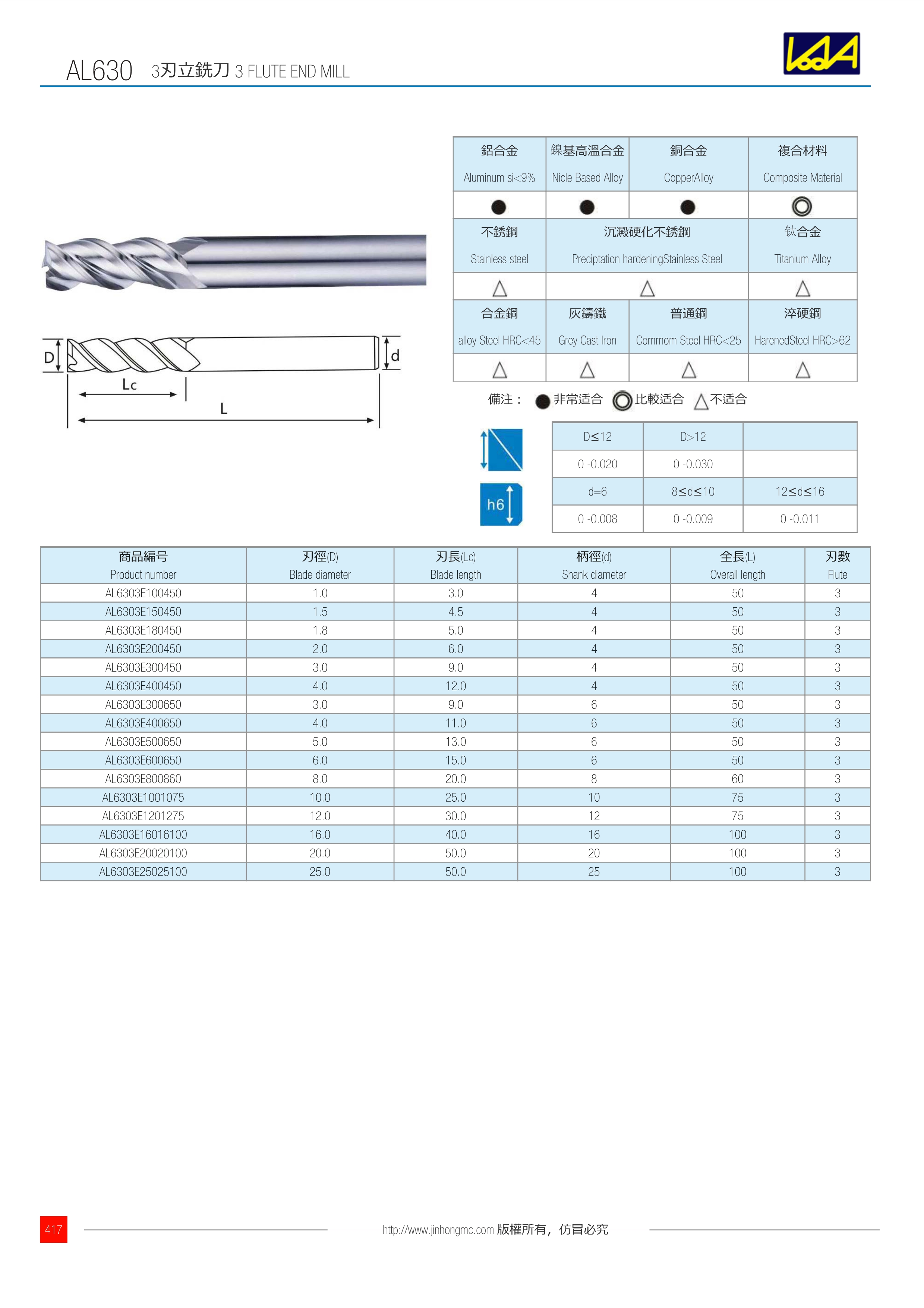 | 商品編號 Product number | 刃徑(D) Blade diameter | 刃長(Lc) Blade length | 柄徑(d) Shank diameter | 全長(L) Overall length | 刃數 Flute |