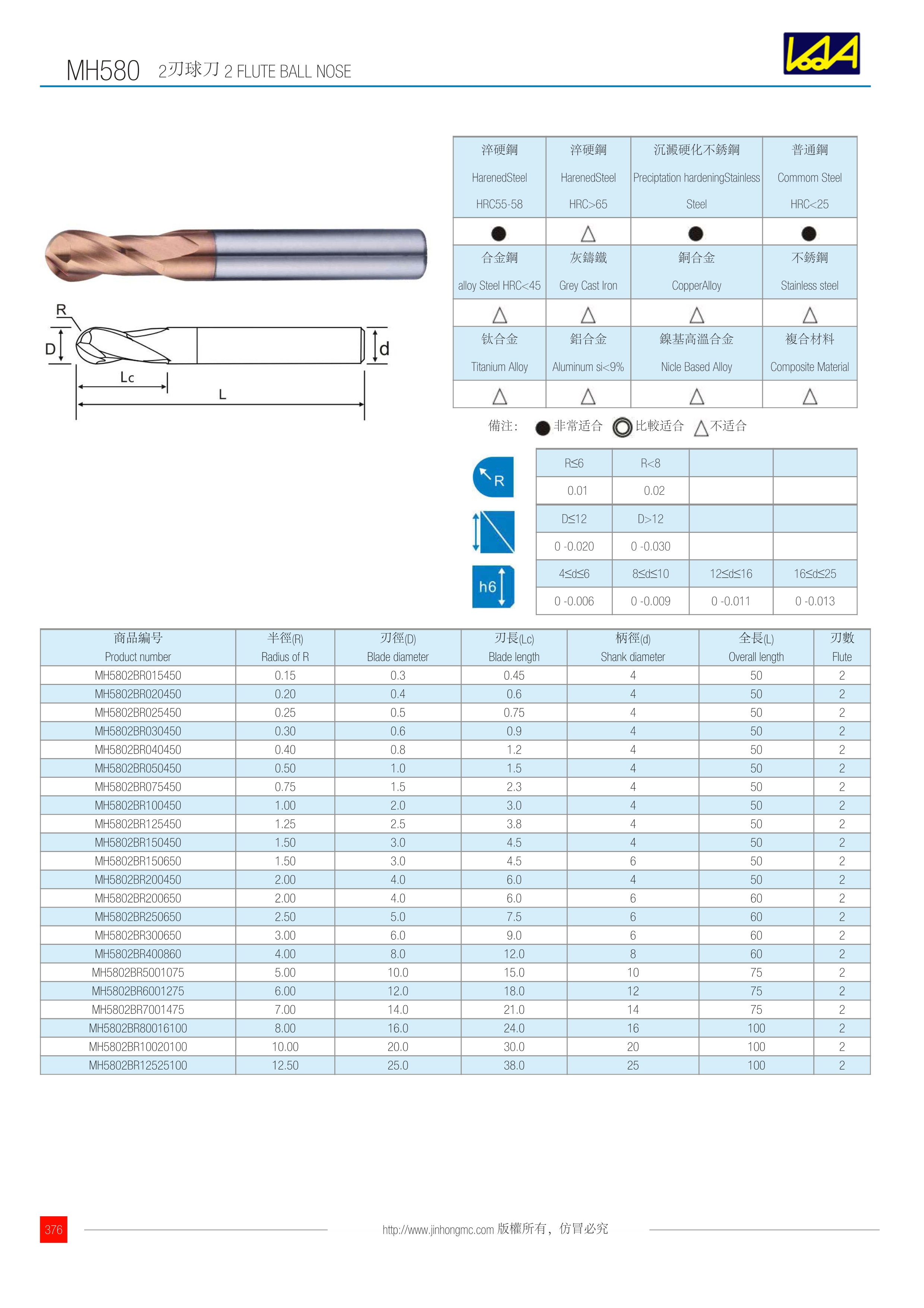 | 商品編號 Product number | 半徑(R) Radius of R | 刃徑(D) Blade diameter | 刃長(Lc) Blade length | 柄徑(d) Shank diameter | 全長(L) Overall length | 刃數(shù) Flute |